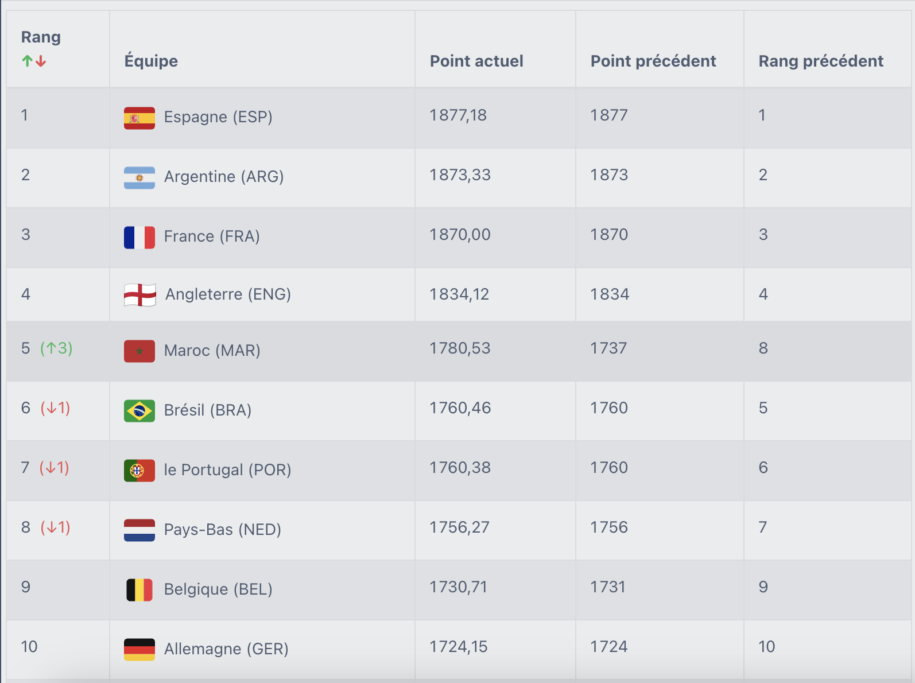 Classé 8e avant la décision, le Maroc gagne deux places et s’installe dans le Top 5 mondial derrière l’Angleterre, la France, l’Argentine et l’Espagne. Une progression qui confirme la montée en puissance de la sélection marocaine sur la scène internationale.